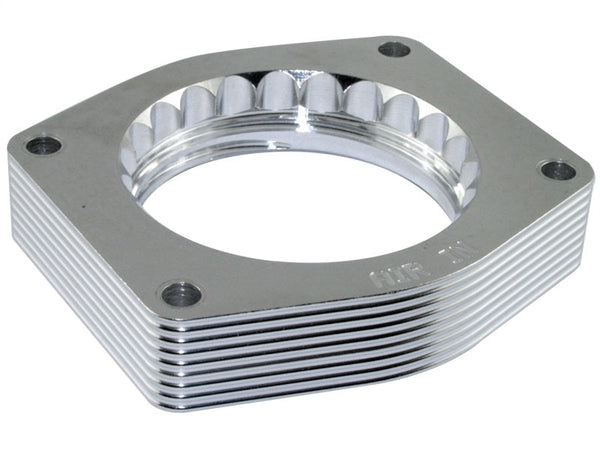 Silver Bullet throttle body spacers create turbulence in the air flow at the point just prior entry into the engine increasing horsepower, torque and improving throttle response and fuel efficiency. Silver Bullet throttle body spacers are constructed out of durable T-6061 billet aluminum and using a unique serrated/helix entry to create turbulence at the manifold while eliminating the annoying whistle found in other helix only throttle spacers.